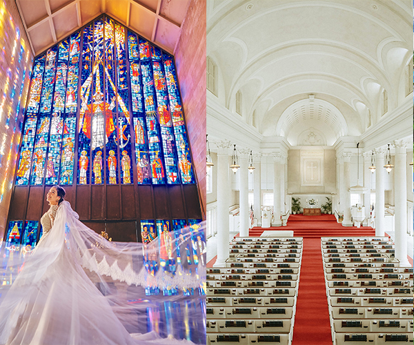 美しいステンドグラスや回廊などでお写真映えも