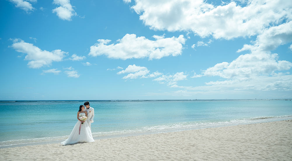 グアムの2大ホテルがフォトウエディングの舞台。万が一雨天でも優雅で落ち着いた雰囲気が漂うホテル内フォトを代替スポットとしてご用意いたします。また、グアムでの滞在をもっと楽しめる特別優待「RESORT PASSPORT」をプレゼント!