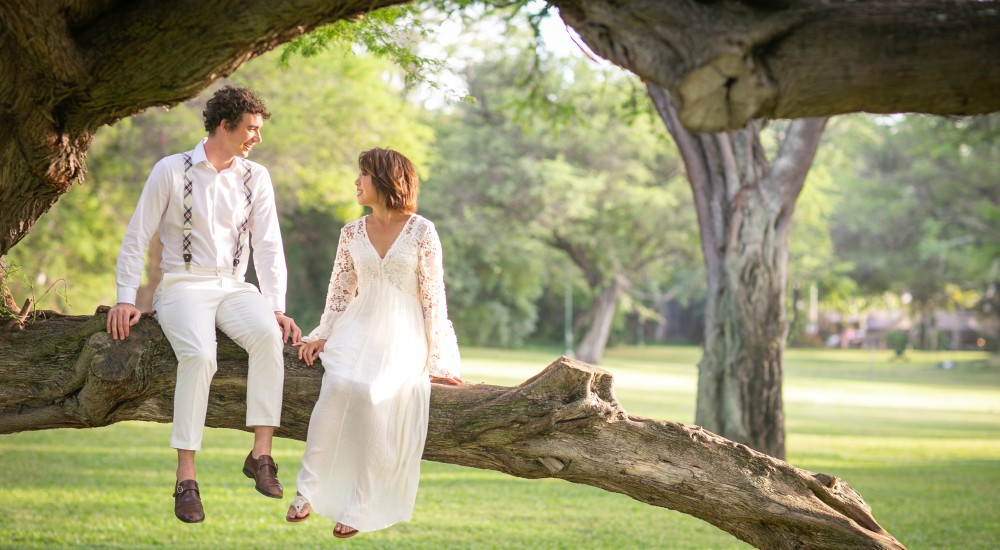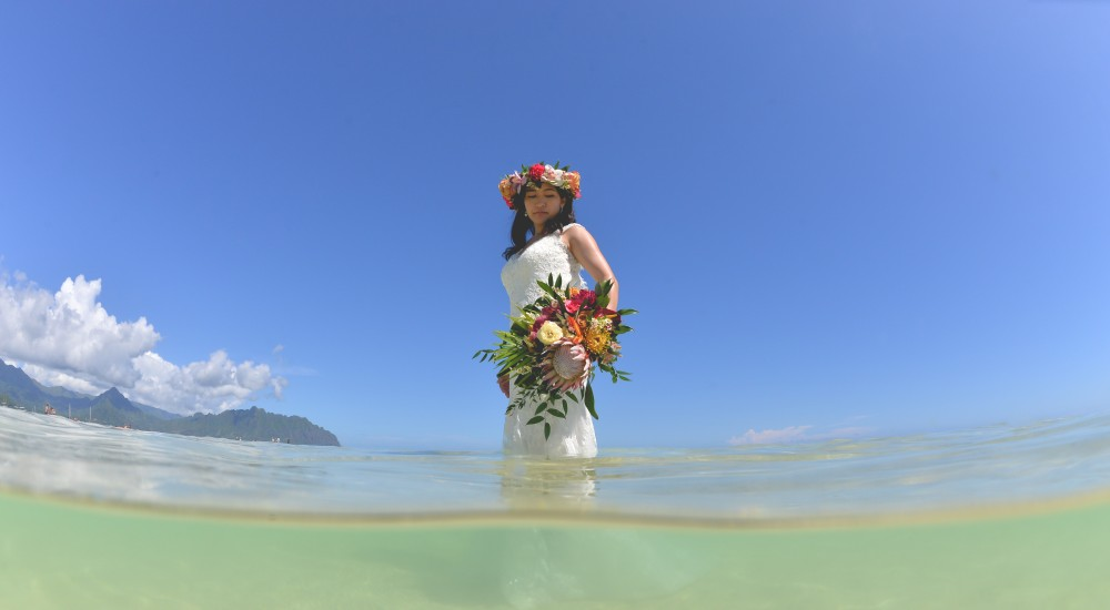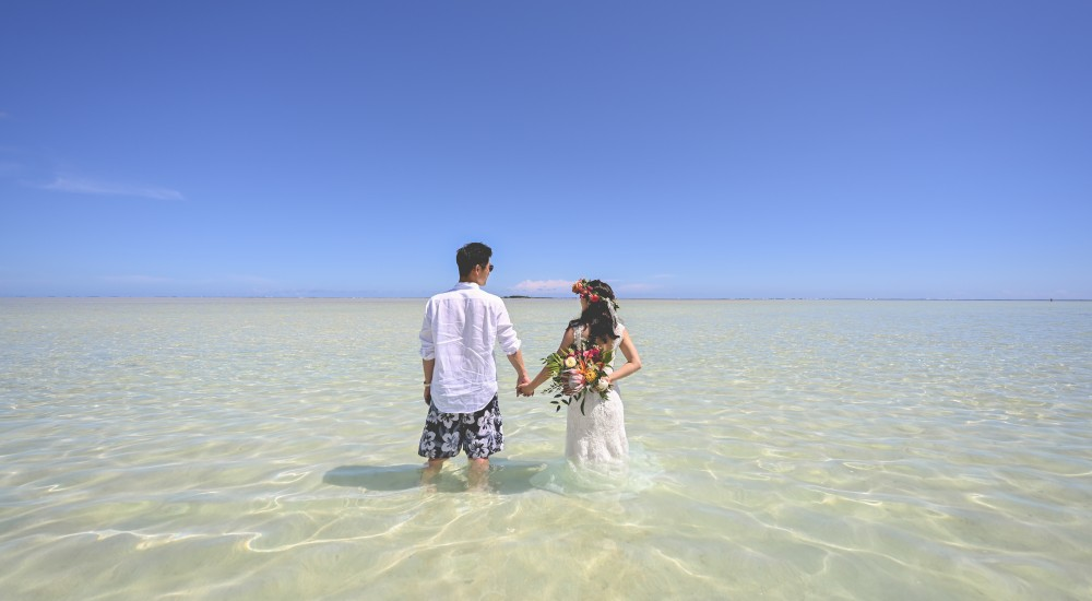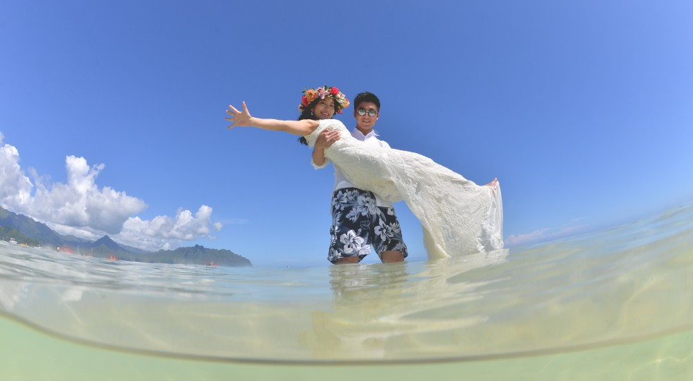 衣裳・ヘアメイク全て込みだから手ぶらで来ていただければOK!ハワイの青い海、緑豊かな公園をバックに撮影します。