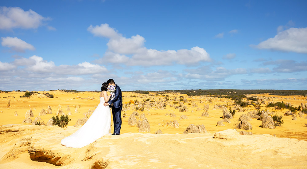 パース近郊にある奇岩群「ピナクルズ」で撮影を行 います。広大な砂漠に点在する独特な景観は、まるで異世界に迷い込んだかのような雰囲気を演出します。