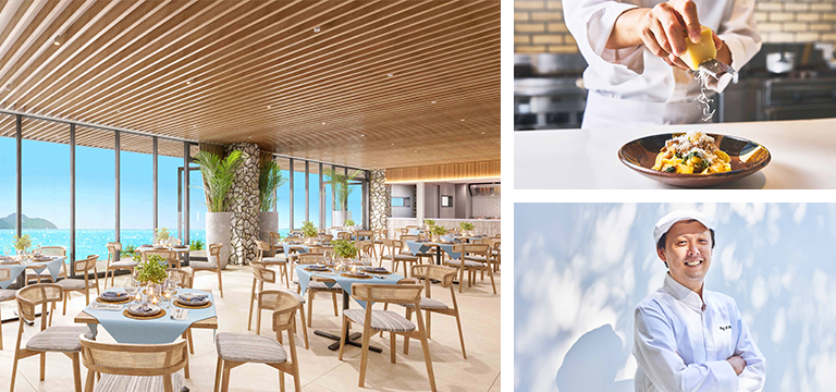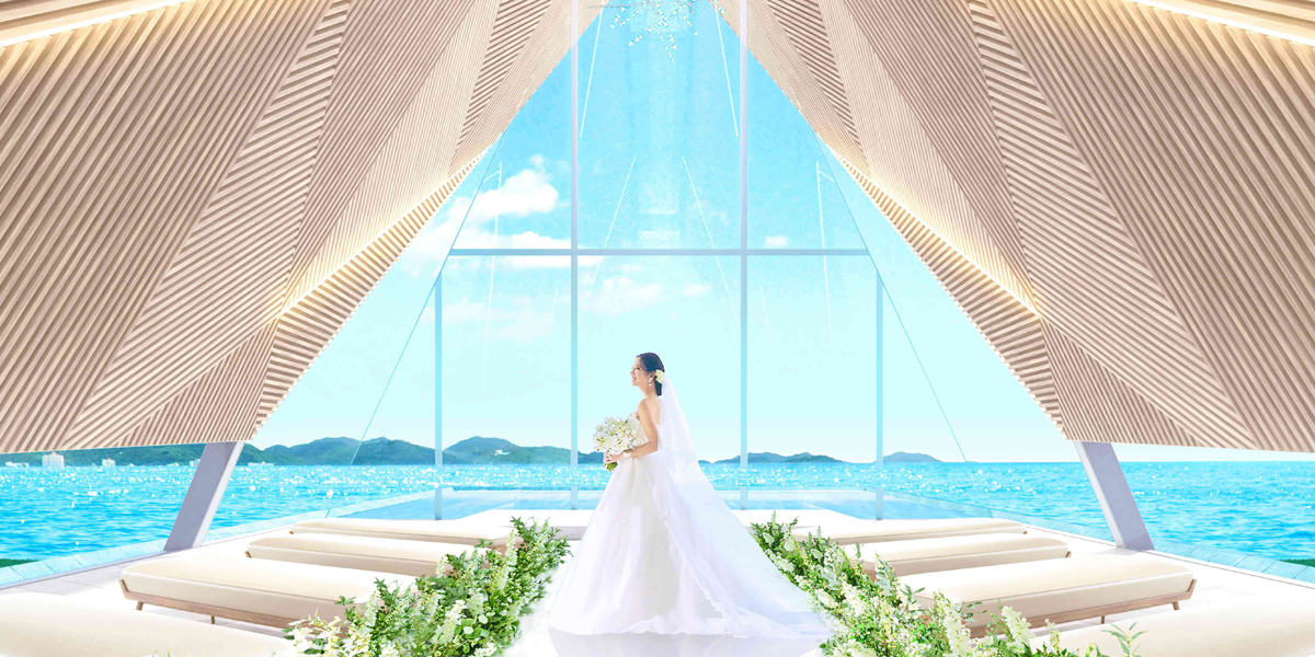 挙式前の「CINQムービー」で感謝を伝え、感動の余韻の中で幕を開ける特別な時間。天井高8mのチャペルには、フルートとピアノの清らかな音色が響き渡ります。また、16:30限定のガーデン挙式では、海風とともにオルガンと管楽器の調べが祝福。海と空、そして降り注ぐ音色に包まれる、至福のセレモニーを叶えます。