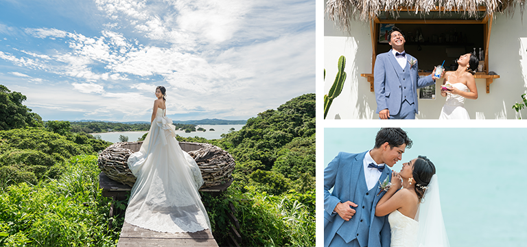 おふたりでの撮影はもちろん、参列してくれたゲストと共に、ビーチフォトを楽しむことができる。 さらにオプションでフォトツアーに繰り出そう。名護の緑豊かな風景を背景に撮るOKINAWAネイチャー、西に向いている海だからサンセット撮影も移動時間をかけなくてもできる。